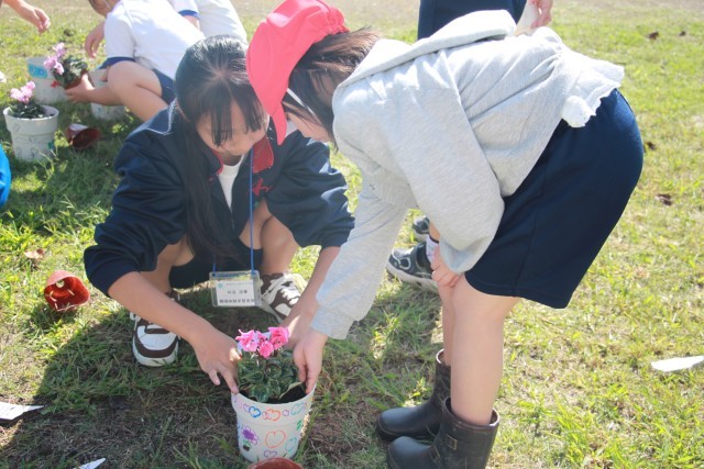 10月25日(土)の創立150周年記念式典に向けて、きれいな花でお祝いムードを高めようと企画しました。子どもたちは、白地の鉢にメッセージを書いたりイラストを付けたりしてデコレーションしました。その鉢に、きれいなシクラメンを植え込みます。職場体験に来ていた新井中学校生2名もお手伝いしてくれました。「お客さんも、この花と鉢を見たら鵜顔になるね」と、子どもたち自身がなにより楽しそうですね。