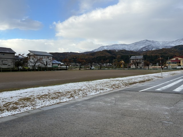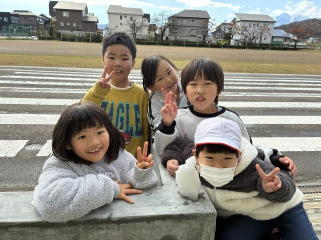 うっすら積もった校庭の雪を集めて、1年生が雪だるまをつくりました。