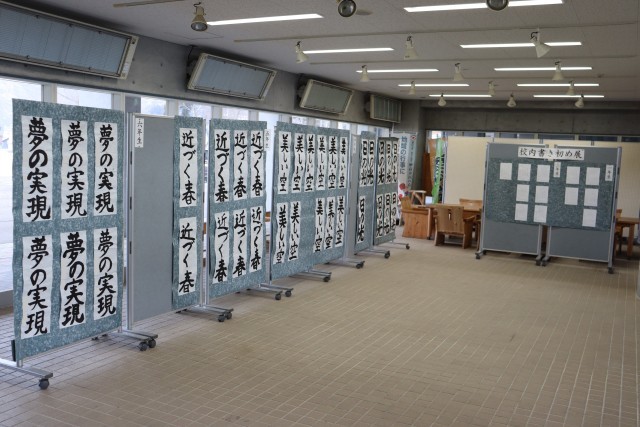 本日(1月19日)から30日(金)の夕方まで、地域交流スペースにて校内書き初め展を行っています。