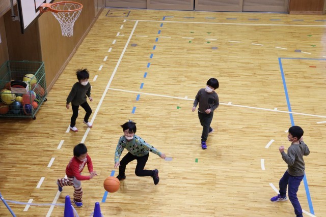 体育館中を走り回ってバスケットボールをする子どもたち。