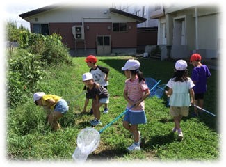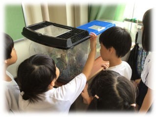 9月16日(火)に、学校の畑で虫とりをしました。トノサマバッタやショウリョウバッタ、オンブバッタにコオロギと、たくさんの虫たちを捕まえることができたので、子どもたちは大満足です。その後、土や草を入れて環境を整えた飼育ケースの中で、大切に飼い、観察をしました。「でっかいうんちをしたよ。」「足がとっても長いね。」「お腹がピンク色だよ。」「むしゃむしゃと葉っぱを食べているよ。」「なすがでこぼこになっているよ。きっと、食べたんだね。」「ジャンプして、逃げようとしているのかな。」等々、みんな、様々な発見をしていました。時間があれば、飼育ケースを覗き込み、虫たちの様子を観察したり、えさを家から持ってきたりしている姿を見ると、生き物を飼うことへの関心が高まったことがよく分かります。これからの、動物飼育も楽しみですね。