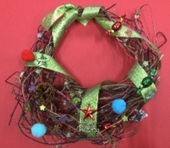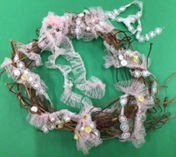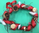 アサガオのつるで作ったリースに飾りつけをしました。どんな風にリボンや毛糸を巻き付けようか、どの部分にどの飾りを付けようか、楽しみながら一生懸命に取り組みました。どれ一つとして似たものがない、自分だけの素敵なリースが出来上がりました。