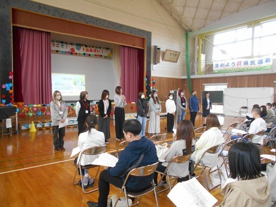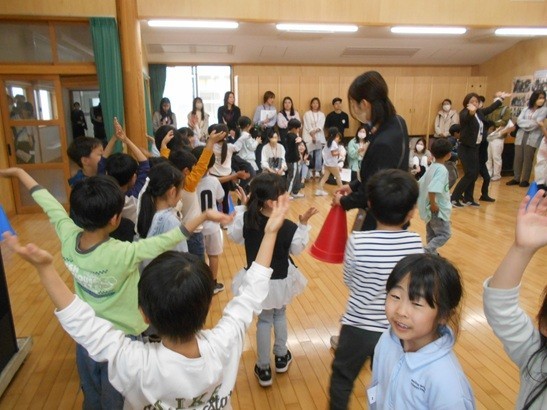 1年生は「なかよしタイム」。音楽にのって仲間づくりゲームや絵本の読み聞かせを楽しみました。