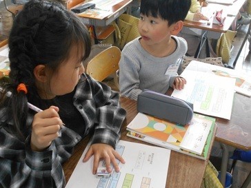 2年生は「算数」。10のまとまりに注目してタブレットの中でブロックを動かして考えました。