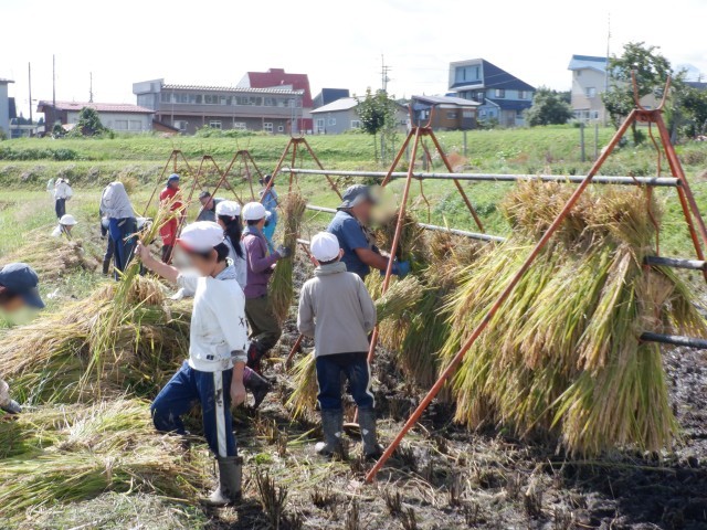 始めは、慣れない様子でおっかなびっくり刈っていましたが、段々とテンポよく刈ることができるようになり、「刈って、揃えて、縛って」を繰り返しました。慣れてくると自分たちで声をかけ合いながら、稲の束を運ぶ人、緩んだ稲を縛り直す人、落穂を拾う人と、連携してはさかけまでの仕事をやり抜きました。