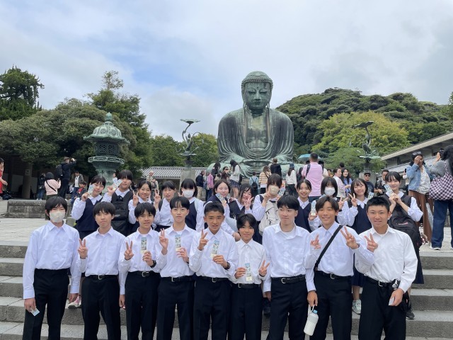 修学旅行③ 公開日 2025/10/15 更新日 2025/10/15 おしらせ 鎌倉の大仏に来ました!圧巻の大きさです!この後は、お土産を買ったり、付近を散策したりと自由タイムです!少し距離がありますが、鎌倉の長谷寺に向かうグループもいます!ゆったり過ごせています!(掲載した写真の転載、無断使用、加工等はご遠慮ください)