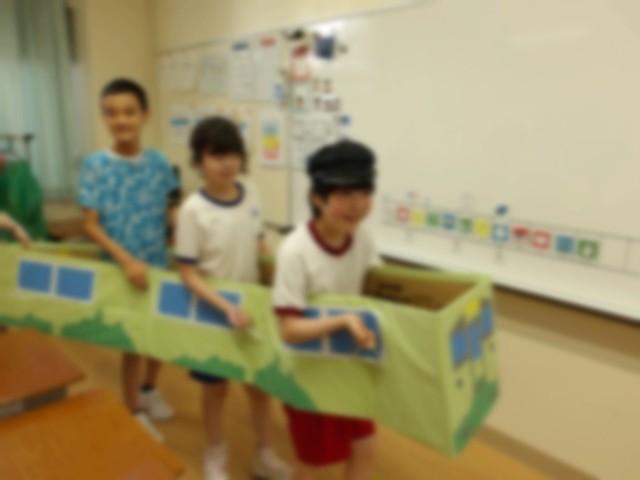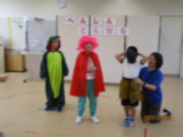 読み聞かせを見たり聞いたりし、その内容に関する遊びをして楽しみました。ビッグブック「へんしんトンネル」の読み聞かせを楽しんだ後は、子どもたちもトンネルをくぐって変身! 恐竜やプリンセス、ゴリラのお面にアフロヘアーまで、思わず笑ってしまうような姿で登場しました。また「でんしゃでいこう でんしゃでかえろう」を読んだあとは、みんなで電車ごっこをしました。順番や停車する駅を相談して、いざ出発! スピードを合わせながら廊下を進みました。